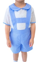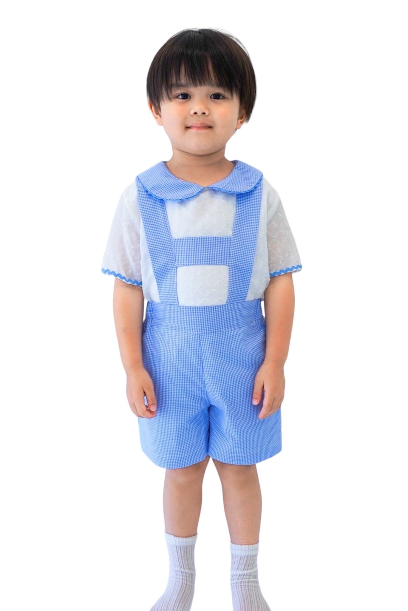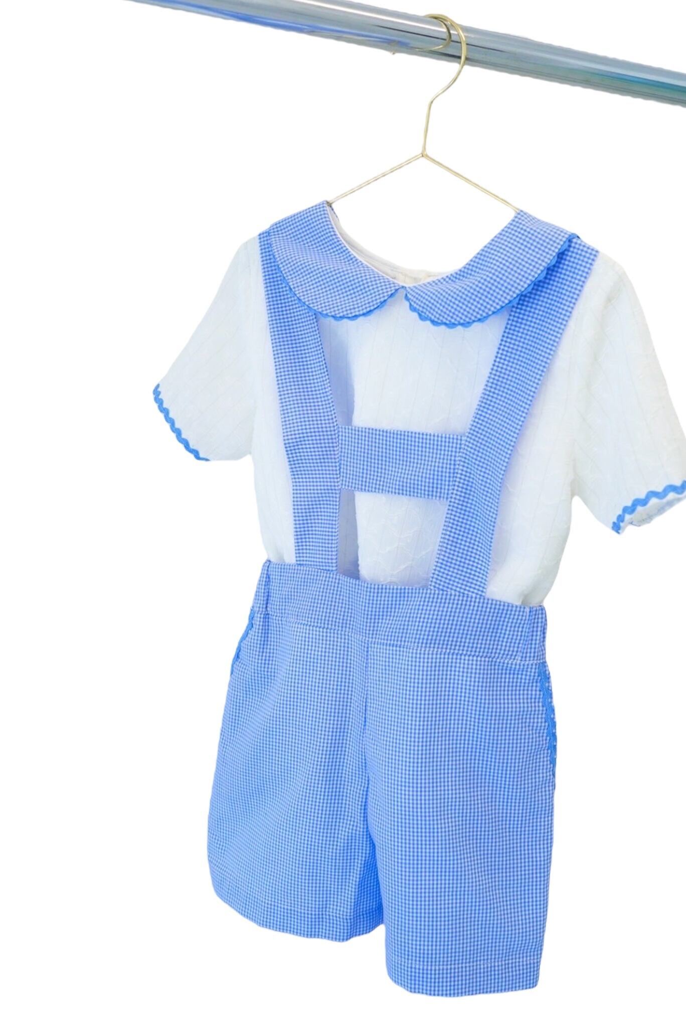 ギンガムチェックの爽やかな水色が可愛い、異素材の丸襟セットアップ。